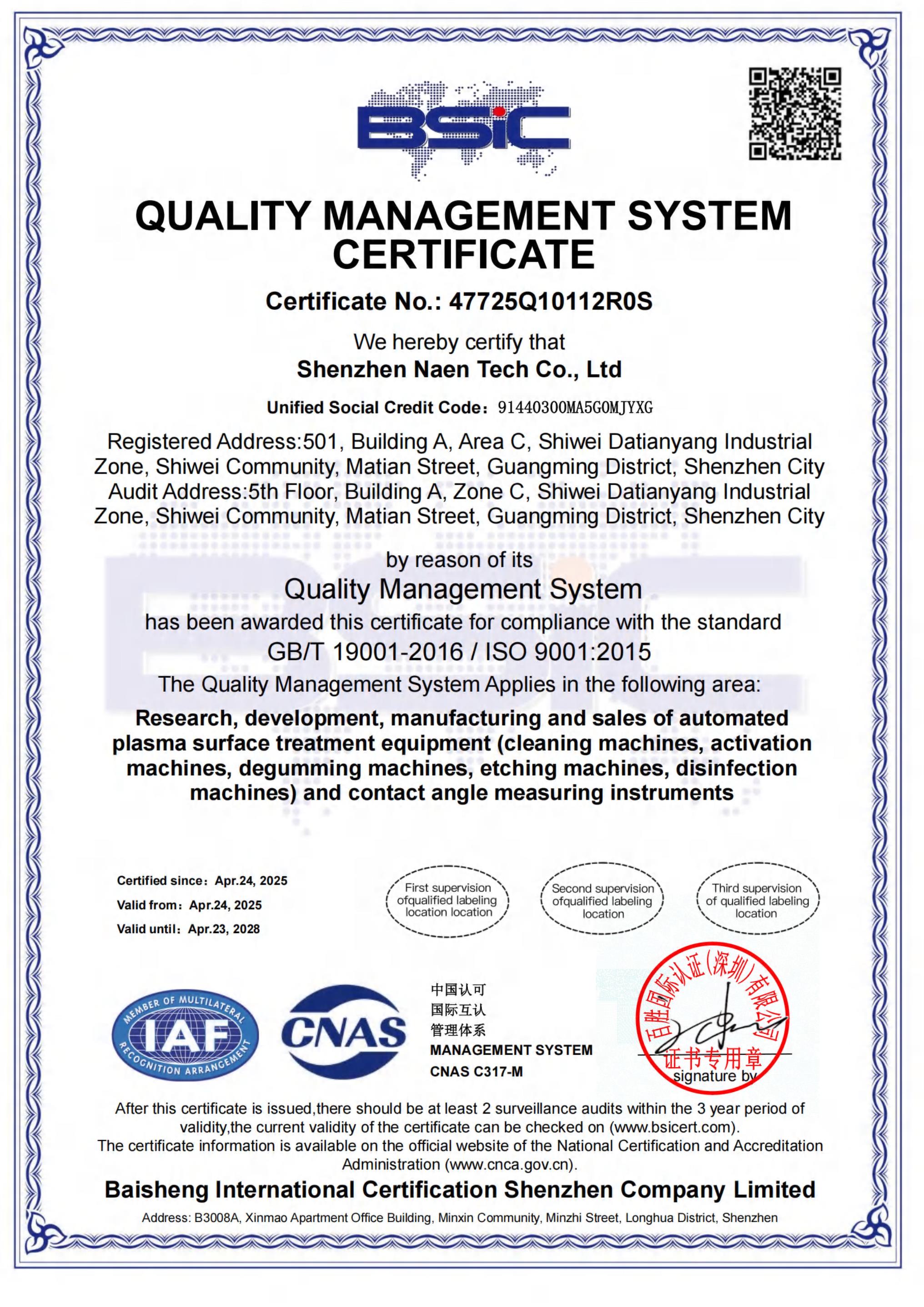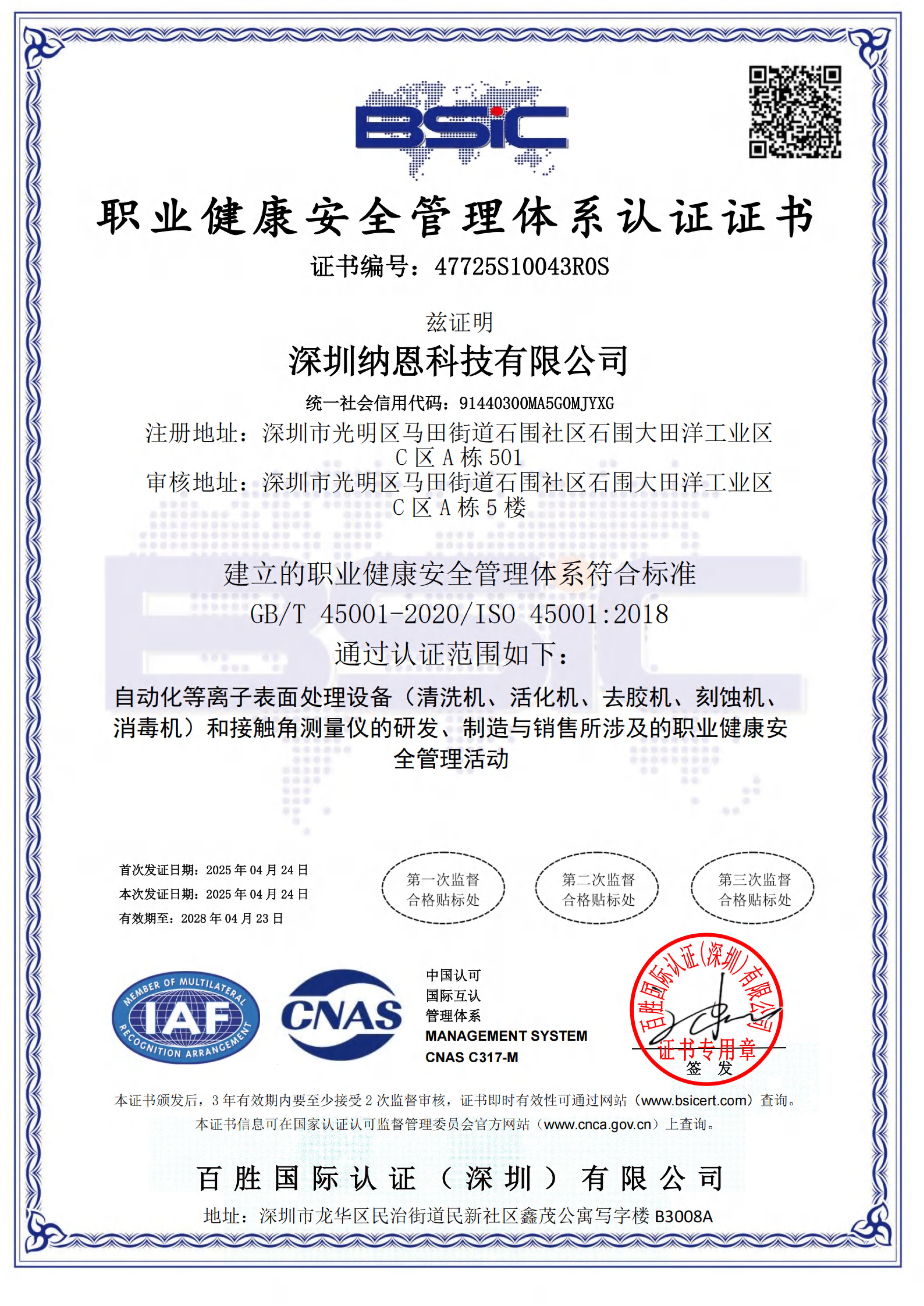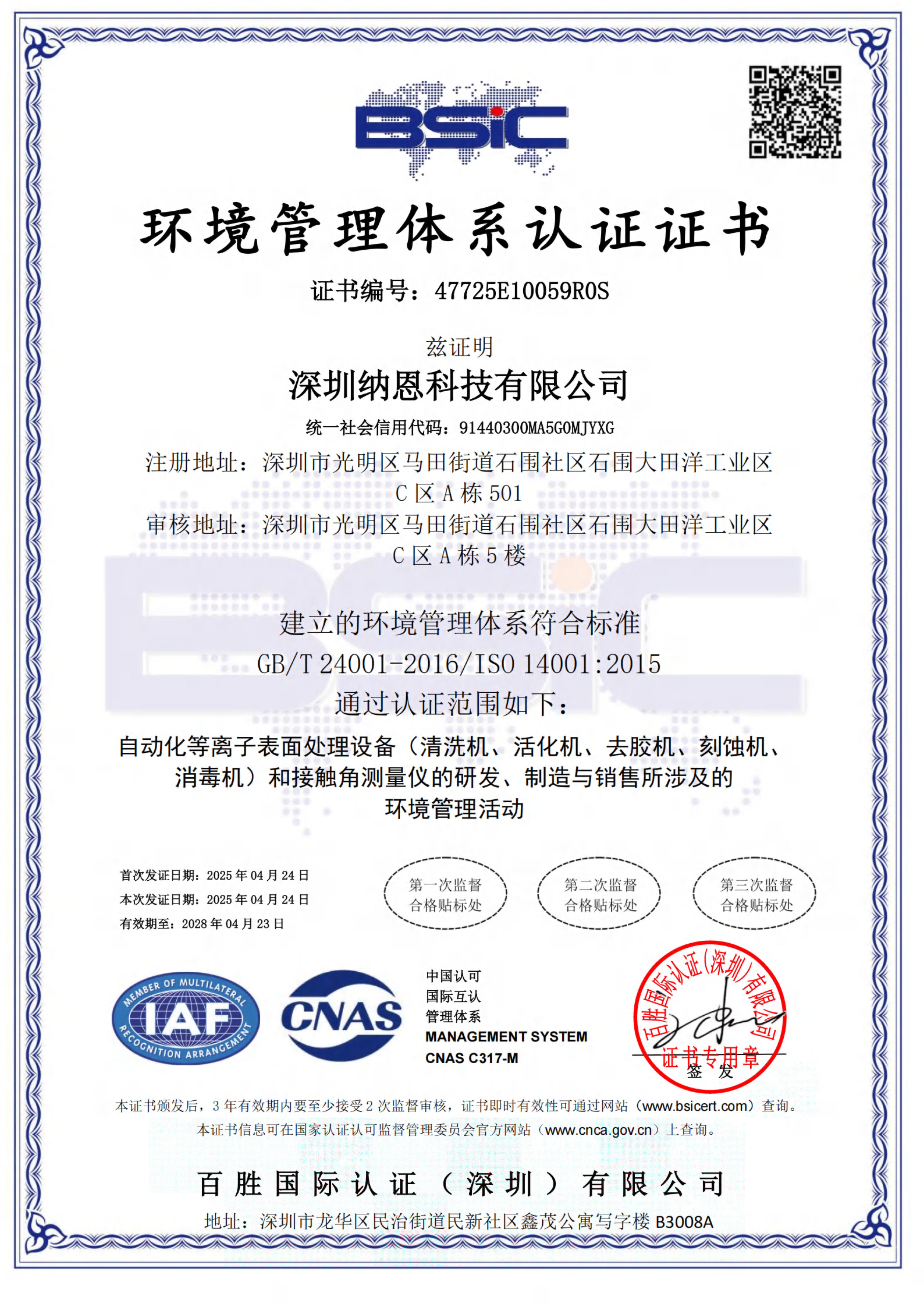 深圳納恩科技有限公司始創于2010年,總部位于深圳市,在香港設有研發分公司,是一家專注于低溫等離子體(plasma)技術應用和高端智能裝備研發,制造和銷售的高科技公司。目前主要產品包括大氣及真空等離子清洗機、等離子去膠機、等離子刻蝕機、等離子表面處理設備、電暈機、低溫介質阻擋放電裝置(DBD)等。